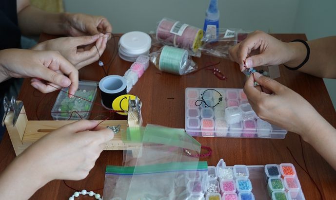 이들이 만들고 있는 건 비즈로 만든 장신구다. 구슬 팔찌 10개, 비즈 팔찌와 반지 각 50개가 목표다.