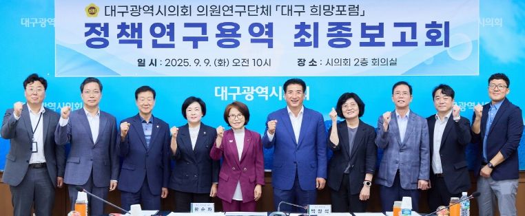 한편, ‘대구 희망포럼’은 미래세대를 위한 지역 정책 발굴과 제도 개선 방안을 모색하고자 작년 8월 결성된 연구단체로, 황순자 의원(대표), 이성오 의원(간사)을 비롯해 김대현, 박창석, 윤권근, 이재숙, 임인환, 정일균, 조경구 의원 등 9명이 활동하고 있다.
