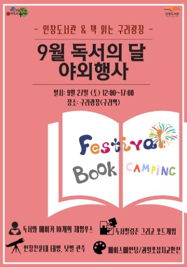 내고향뉴스 관리자 기자 | 구리시 인창도서관은 9월 독서의 달을 맞아 오는 9월 27일 오후 12시부터 5시까지, 시민 누구나 참여할 수 있는 야외 독서문화 행사 『책 읽는 구리광장』을 운영한다고 밝혔다.