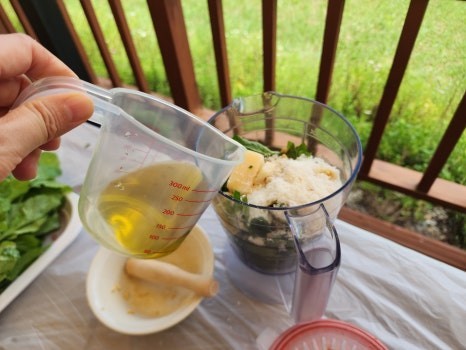 잣과 치즈, 곰취와 깻잎 올리브유 레몬을 넣고 갈갈갈 갈아 줍니다.