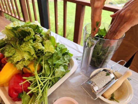 직접 수확한 재료로 함께 요리를 만들어봅니다. 막 수확한 깻잎과 곰취가 주 재료, 만드는 동안 그 진한 향이 입맛을 돋네요.