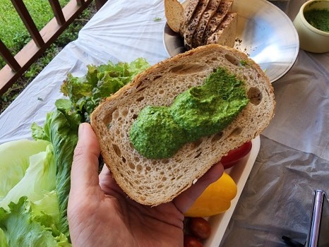 금방 만들어 낸 깻잎 곰취 페스토를 준비된 곡물 빵에 발라 먹어도 되고요, 오늘의 야심작 따뜻한 강원도 옹심이에 넣어 파스타처럼 먹었는데 정말 색다른 맛을 느낄 수 있는 시간이었답니다.