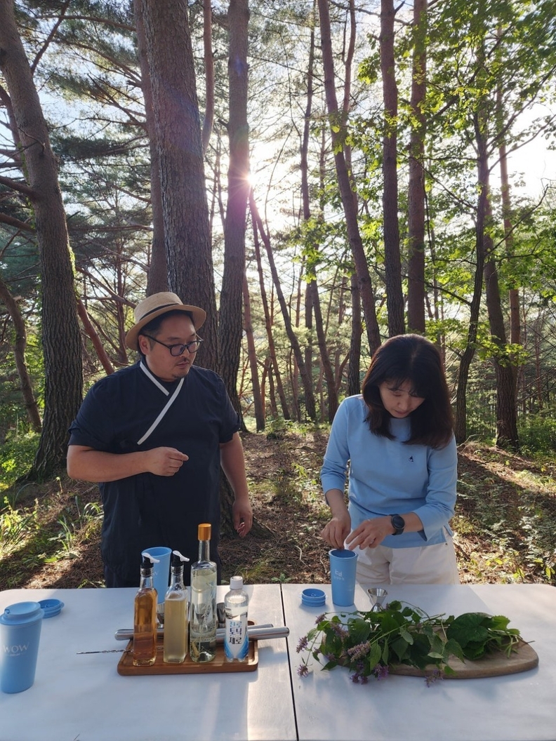 그냥 입 안에 산 하나를 부어주는 느낌입니다. 나무향 풀향의 조합이 아주 멋진 곰취모히또 만들기 체험.