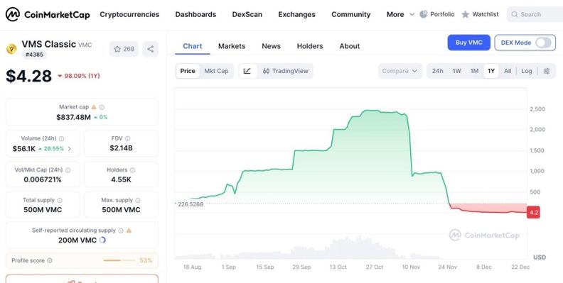 출금정지처분의 결정적 요인은 자체 발행한 VMC 코인이 불법매도된 사건이다. 2025년7월에 최초 미국 거래소인 Bitmart 에 상장한 VMC 는 상장가 $10을 시작으로 높은 상장 시작가임에도 불구하고 2개월만에 $600 대를 돌파했다. 사건이 터지기 11월4일 전까지는 $2,400 까지 넘어서는 놀라운 기록을 보였지만 결국 불법매도가 시작된 LBank 가 빅토리아 거래소를 금융당국에 신고하면서 현재는 상장가 미만으로 가격이 폭락하게 되는 희대의 사건으로 전락하고 말았다.
