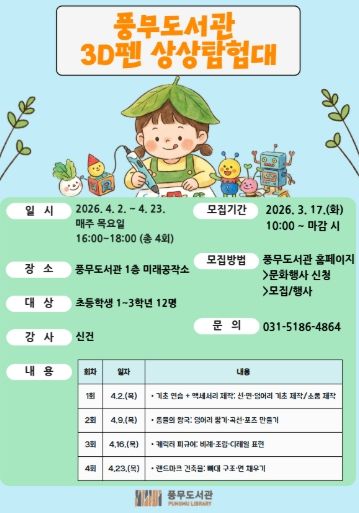 내고향뉴스 김명신 기자 | 김포시 풍무도서관은 초등학생 1~3학년을 대상으로 ‘3차원 펜 상상탐험대’를 오는 4월 2일부터 4월 23일까지 매주 목요일 오후 4시부터 6시까지 총 4회에 걸쳐 운영한다.