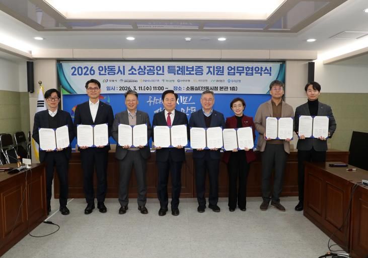 내고향뉴스 장우석 기자 | 안동시는 3월 11일 시청 소통실에서 경북신용보증재단 및 6개 협약은행과 함께 '2026년 안동시 소상공인 특례보증 지원 업무협약'을 체결했다.