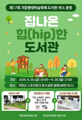 내고향뉴스 임정빈 기자 | 거창군립한마음도서관과 경상남도교육청 거창도서관은 오는 26일부터 28일까지 3일간 거창군 스포츠파크 일원에서 개최되는 제17회 거창평생학습축제 동안 『집나온 힙(hip)한 도서관』 부스를 운영한다고 밝혔다.