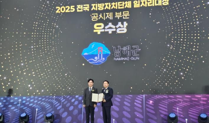 내고향뉴스 임정빈 기자 | 남해군이 9월 30일 청주 오스코에서 열린 고용노동부 주관 ‘2025년 전국 지방자치단체 일자리 대상’ 시상식에서 공시제 분야 우수상을 수상했다. 이번 수상은 2016년 우수상 이후 9년 만에 거둔 성과다.