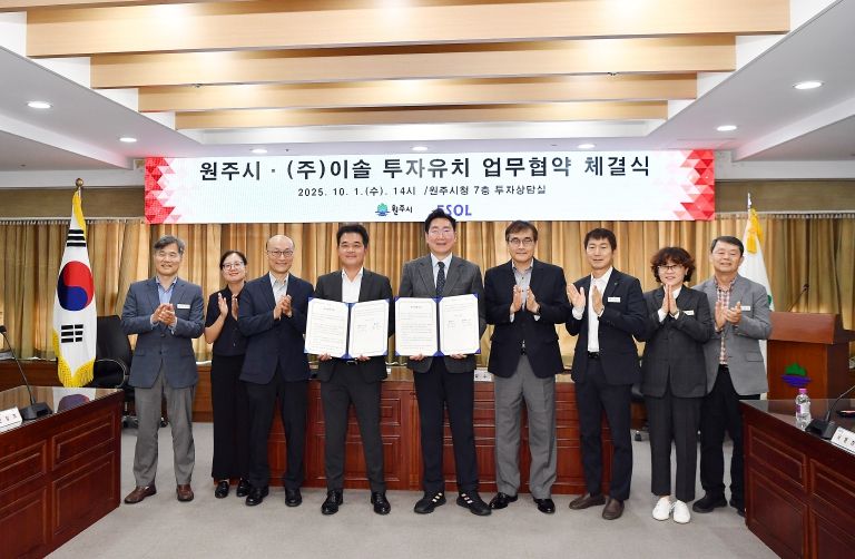 내고향뉴스 이경희 기자 | 원주시는 10월 1일 오후 2시, 시청 7층 투자상담실에서 ㈜이솔(대표 김병국)과 투자유치 협약(MOU)을 체결했다. 이번 협약은 총 505억 원 규모의 투자로, 부론일반산업단지에 소형 방사광가속기와 첨단 EUV 반도체 검사장비 연구·생산시설을 구축하는 사업이다. EUV(Extreme Ultra-Violet)는 반도체 초미세 공정(7nm 이하)에 필수적인 광원이다.