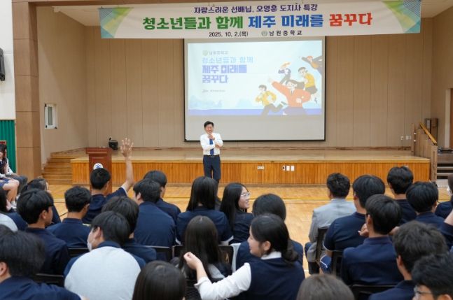 내고향뉴스 채필재 기자 | 오영훈 제주특별자치도지사는 2일 남원중학교(교장 오경석)를 찾아 전교생을 대상으로 특별강연을 열고, “남원과 제주를 넘어 아시아, 나아가 우주까지 여러분의 무대가 돼야 한다”며 청소년들의 꿈과 도전을 격려했다.