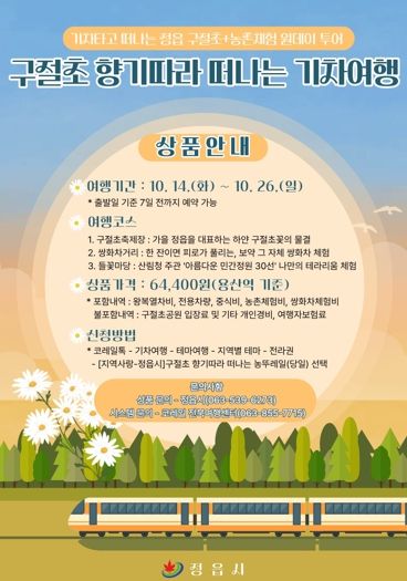이번 ‘농뚜레일 투어’는 산림청이 주관한 ‘아름다운 민간정원 30선’에 이름을 올린 농촌체험농장 ‘들꽃마당’에서 나만의 정원 만들기 테라리움 체험으로 시작한다. 이어서 구절초가 만발한 구절초정원을 찾아 가을의 아름다움을 즐기고, 정읍 9경 중 하나인 쌍화차 거리를 둘러보며 지역 고유의 맛과 멋을 느낄 수 있도록 짜였다.