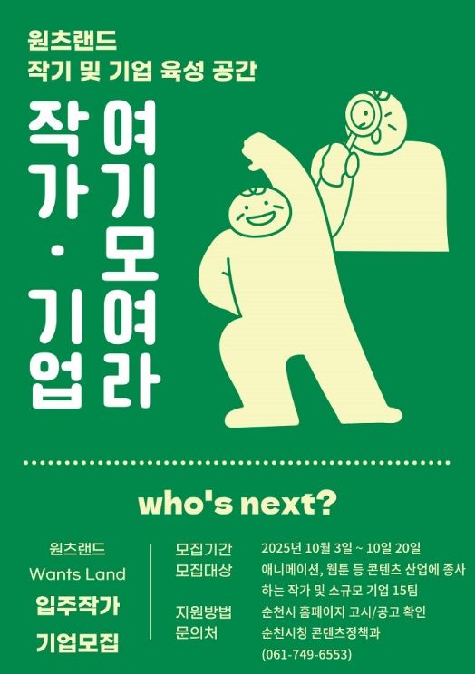 내고향뉴스 박성환 기자 | 순천시는 문화콘텐츠산업 활성화를 위해 오는 20일까지 ‘문화콘텐츠 작가 및 소규모 기업 육성 공간’ 입주 모집을 한다고 밝혔다.