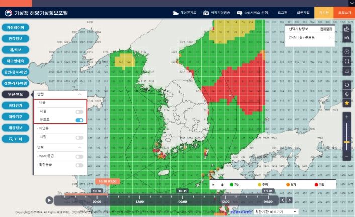 우리나라 주변 해상에 대한 너울 위험 예측정보는 기상청 해양기상정보포털을 통해 확인할 수 있다.