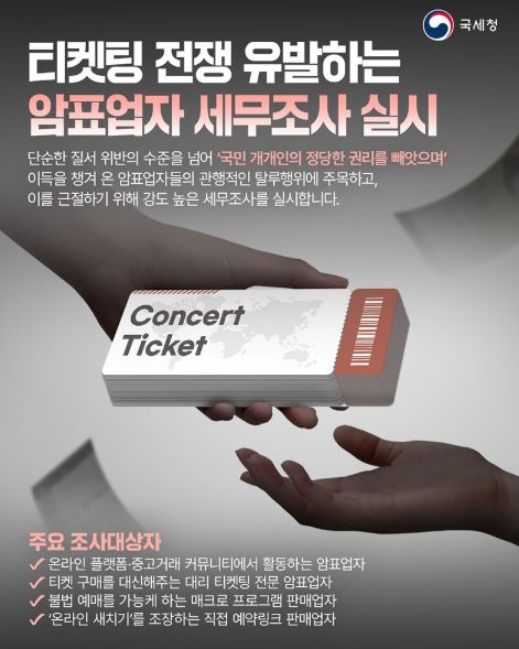 내고향뉴스 정미경 기자 | 단순한 질서 위반의 수준을 넘어 '국민 개개인의 정당한 권리를 빼앗으며' 이득을 챙겨 온 암표업자들의 관행적인 탈루행위에 주목하고, 이를 근절하기 위해 강도 높은 세무조사를 실시합니다.