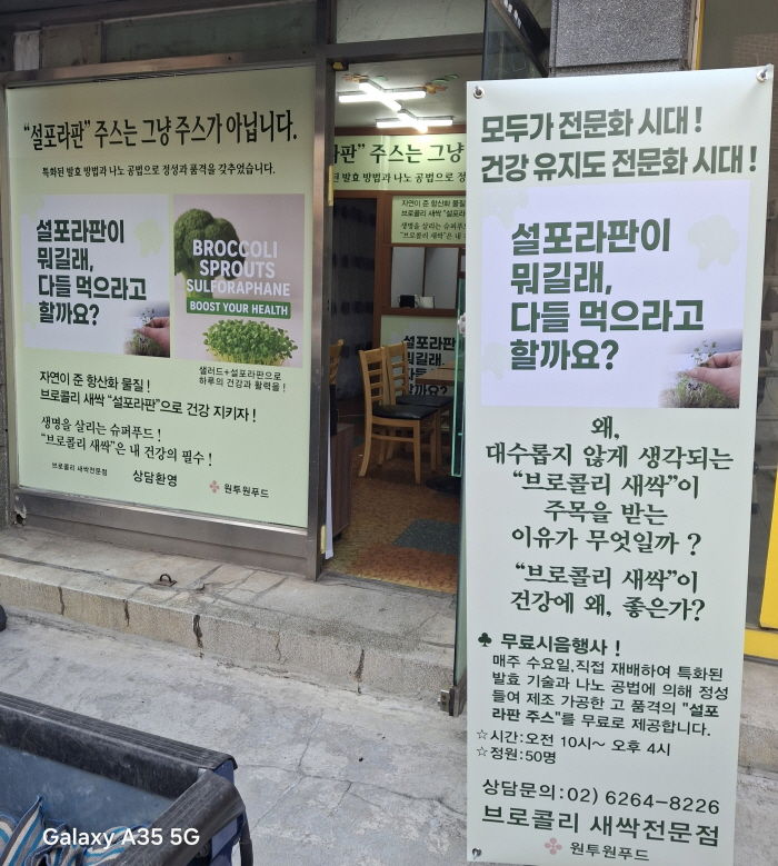 이번 1호점 개설을 주관한 원투원푸드 직영 전문점은 일반적으로 대수롭지 않게 여겨지는 브로콜리는 새싹에서 ‘설포라판’이 풍부하여 건강의 효능으로 인기를 끌고 있는 가운데 이번에 브로콜리 새싹을 특수한 농법으로 직접 재배하여 브로콜리 새싹 주스와 샐러드만 취급하는 전문점이다.