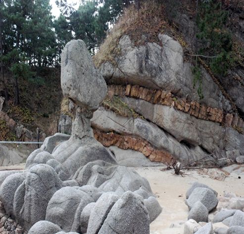 특히 화강암과 규장암이 교호해 만들어진 시루떡 모양의 ‘서낭바위’와, 차별침식으로 버섯 형태로 발달한 ‘부채바위’ 등 자연풍화로 형성된 독특한 암석 지형이 두드러져 지질·지형학적 가치가 높다.