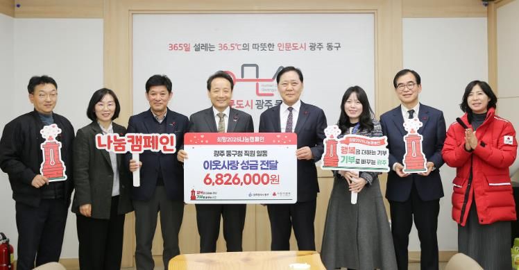내고향뉴스 장우석 기자 | 광주 동구는 지난 6일 구청 접견실에서 ‘희망 2026 나눔캠페인 직원 성금 전달식’을 갖고, 직원들의 자발적인 참여로 모금한 성금을 광주사회복지공동모금회에 전달했다고 밝혔다.