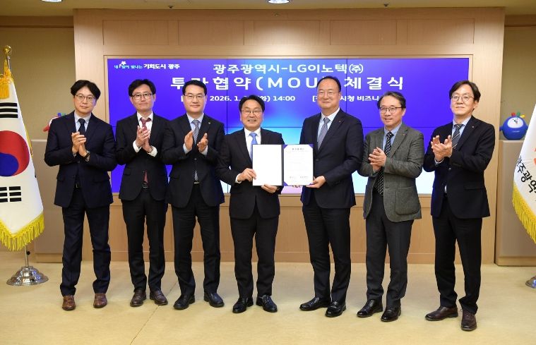 내고향뉴스 장우석 기자 | 광주광역시와 LG이노텍은 13일 시청 비즈니스룸에서 ‘차량용 제어모듈 신규 생산라인 구축을 위한 투자협약’을 체결했다. 이번 협약은 2026년 새해 부강한 광주로의 힘찬 도약을 알리는 첫 신호탄이다.