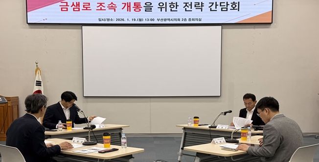 내고향뉴스 김익성 기자 | 부산광역시의회 이준호.이종진 의원은 1월 19일 오후 1시, 시의회 중회의실에서 '금샘로 조속 개통을 위한 전략 간담회'를 개최했다. 이번 간담회는 산성터널 접속도로 미개설 구간인 금샘로 공사의 지연 원인을 점검하고, 조속한 사업 추진을 위한 실질적인 해결 방안을 모색하기 위해 마련됐다.