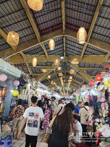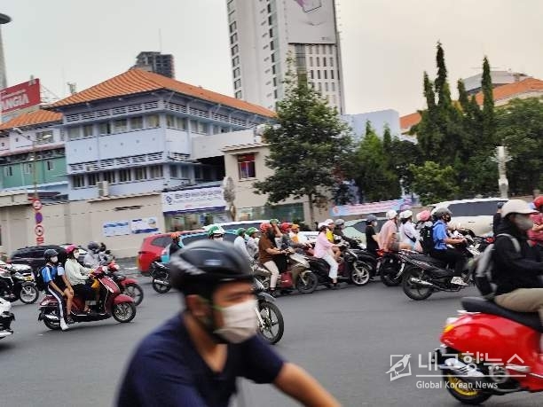 주변에는 저층 상가와 가로수가 늘어서 있고, 뒤편으로는 대형 광고판이 부착된 고층 건물이 보인다. 도로 폭에 비해 오토바이의 비중이 압도적으로 높아, 자동차 중심의 교통 환경과는 다른 도시 풍경을 만들어낸다.