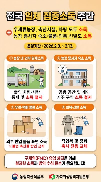 도는 구제역 가축질병 위기 경보를 ‘관심’에서 ‘주의’로 상향했다. 발생 지역과의 역학적 연결 차단을 위해 도내 거점 소독시설 운영을 강화하고, 축산 차량의 소독 필증 휴대 여부를 집중 단속하는 등 차단 방역에 총력을 다하고 있다.