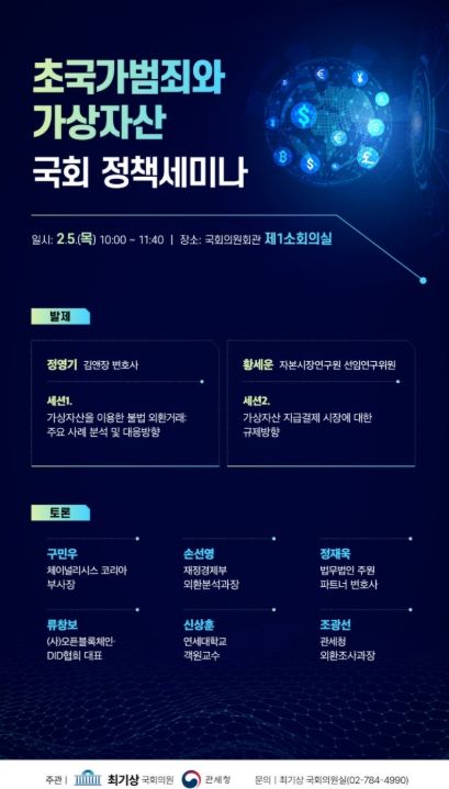 내고향뉴스 임정빈 기자 | 관세청은 최기상 국회의원(더불어민주당·서울 금천구)과 공동으로 2월 5일 국회 의원회관에서 '초국가범죄와 가상자산: 국경을 넘어선 불법 자금 흐름 대응' 국회 정책 세미나를 개최했다.