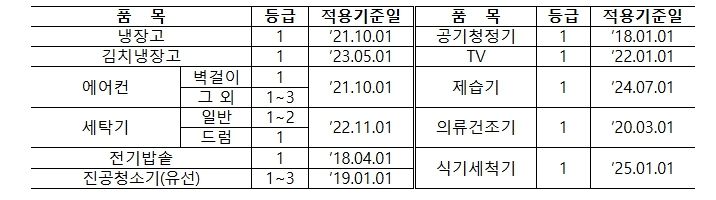 취약계층 고효율 가전 구매지원 사업의 경우, 지원대상은 기초생활수급자, 차상위계층 등 전기요금 복지할인 가구다. 가구당 30만 원 한도로 지원하며 ㉮군에 속한 가구의 환급비율은 30%, ㉯군에 속한 가구의 환급비율은 15%를 지원한다.