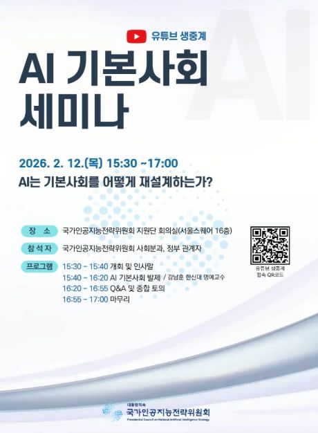 세미나 발제는 강남훈 한신대 명예교수가 맡아, AI시대의 기본사회 개념과 정책적 함의, 그리고 기술 발전에 따른 사회적 위험을 완충하기 위한 제도적 대응 방향을 중심으로 발표할 예정이다. 이날 세미나에는 위원회 위원을 비롯해 과기정통부ㆍ행안부ㆍ복지부 등 AI 기본사회 정책과 관련된 주요 정부 부처 관계자들이 참석한다. 세미나는 유튜브 생중계로 병행 진행되며, AI와 기본사회, 사회 정책에 관심 있는 국민 누구나 온라인으로 시청할 수 있다.