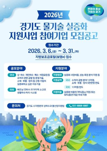 내고향뉴스 윤환열 기자 | 경기도가 ‘2026년 경기도 물기술 실증화 지원사업’ 참여 기업을 공개 모집한다.