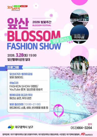 내고향뉴스 김명신 기자 | 대구 남구는 오는 3월 28일 지역의 대표 관광명소인 앞산빨래터공원에서 벚꽃패션쇼 이벤트를 개최한다고 밝혔다.