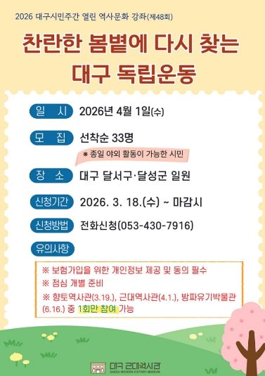 내고향뉴스 김명신 기자 | (재)대구문화예술진흥원 박물관운영본부 소속 대구근대역사관은 2026 대구시민주간 연계행사로 4월 1일 대구시 달서구와 달성군 일원의 대구 독립운동가와 문화유산을 찾아보는 ‘찬란한 봄볕에 다시 찾는 대구 독립운동’ 답사를 개최하며, 참가자를 모집한다.