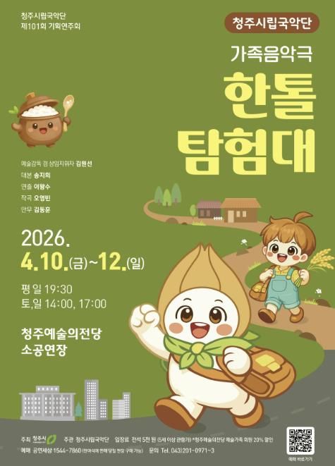 내고향뉴스 김명신 기자 | 청주시립국악단은 4월 10일부터 12일까지 3일간 청주예술의전당 소공연장에서 제101회 기획연주회 가족 음악극 ‘한톨탐험대’를 개최한다고 19일 밝혔다.
