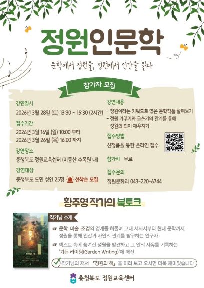 내고향뉴스 김명신 기자 | 충청북도 정원교육센터가 정원을 매개로 한 신체적·정신적 활동과 인문학적 탐색을 통해 도민들의 생태 감수성을 함양하고 인문학적 정원 문화를 정착시키고자 ‘정원인문학(문학 속 정원 읽기)’ 교육을 운영한다.