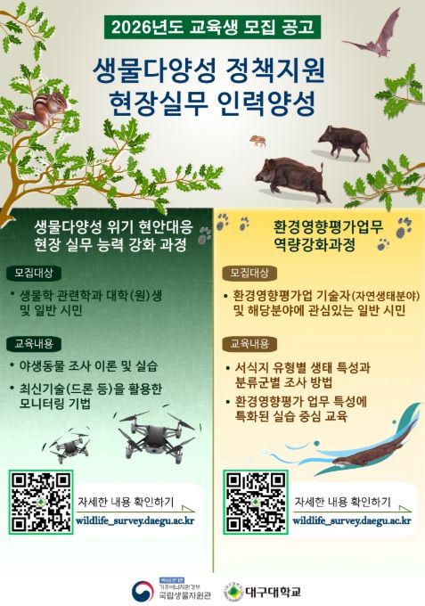 ‘생물다양성 위기 및 환경현안 대응 현장 실무능력 강화 과정’은 생물학 관련 전공 대학·대학원생과 야생생물 조사에 관심 있는 국민을 대상으로 한다. 인공지능(AI), 무인기, 열화상카메라, 무인센서카메라 등 첨단기술을 활용한 최신 생물조사 기법의 이론 및 실습 교육으로 구성되며, 전국 주요 생물 서식지에서의 현장 실습도 진행한다.