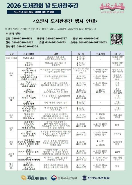 한편, 행사 관련 자세한 내용은 오산시 각 도서관 및 교육포털을 통해 확인할 수 있다.