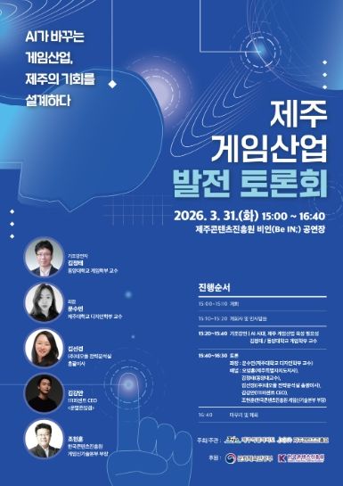 이어지는 전문가 토론은 문수민 제주대학교 디자인학부 교수가 좌장을 맡는다. 오영훈 도지사가 패널로 직접 참여하며, 김정태 동양대 교수, 김선경 네오플 전략분석실 총괄이사, 김강안 111퍼센트 대표, 조현훈 한국콘텐츠진흥원 게임신기술본부 부장이 함께해 제주 게임산업의 현재를 진단하고 미래 발전 방향을 심도 있게 논의한다.