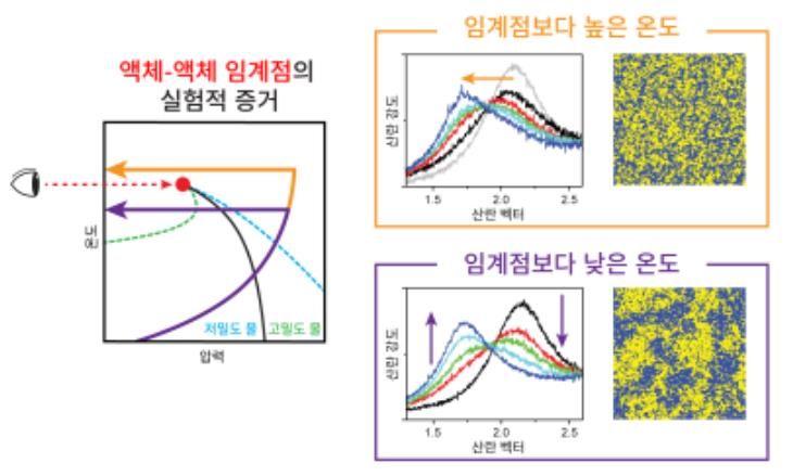 연구팀은 영하 70℃에서도 얼지 않은 물을 만들기 위해 태양보다 수십억 배 밝은 빛을 내며 10조분의 1초 단위로 분자의 움직임을 측정할 수 있는 ‘엑스(X)선 자유전자레이저(PAL-XFEL)’를 활용했고, 실험 끝에 ‘액체-액체 임계점’이 영하 60℃ 부근에 있다는 사실을 세계 최초로 관측하는 데 성공했다.