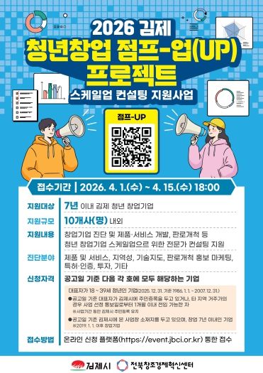 지원 대상은 창업 7년 이내의 김제시 소재 청년 창업기업 10개 사이며, 참여 신청은 2026년 4월 1일부터 15일까지 전북창조경제혁신센터 온라인 신청 플랫폼에서 가능하다. 상세한 심사 및 선정 절차는 홈페이지 공지에서 확인할 수 있다.