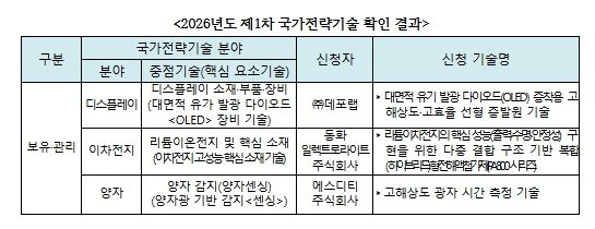 내고향뉴스 김익성 기자 | 과학기술정보통신부와 한국과학기술기획평가원(원장 직무대행 황지호,)은 ‘2026년도 제1차 국가전략기술 확인 신청’에 대해 총 3건의 기술(디스플레이, 이차전지, 양자 분야)이 국가전략기술에 해당하는 것으로 확인했다.
