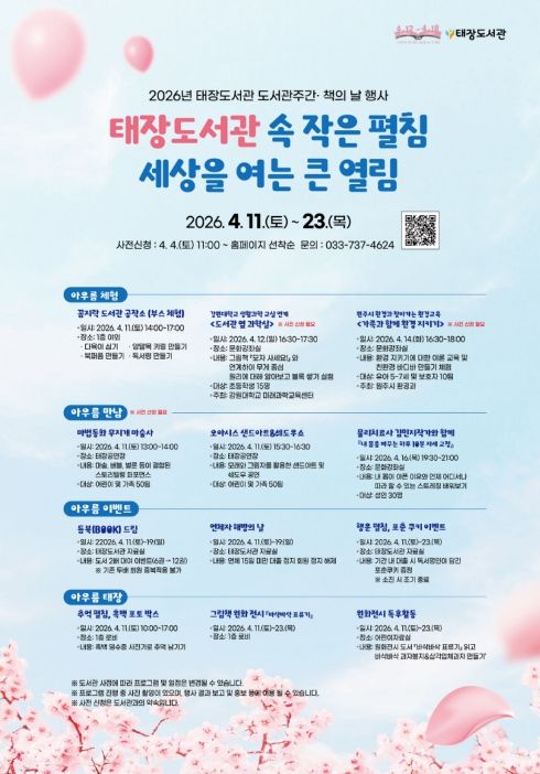 내고향뉴스 김명신 기자 | 원주시 태장도서관은 도서관 주간 및 책의 날을 맞이해 오는 11일부터 23일까지 ‘태장도서관 속 작은 펼침, 세상을 여는 큰 열림’을 주제로 다양한 행사를 개최한다.