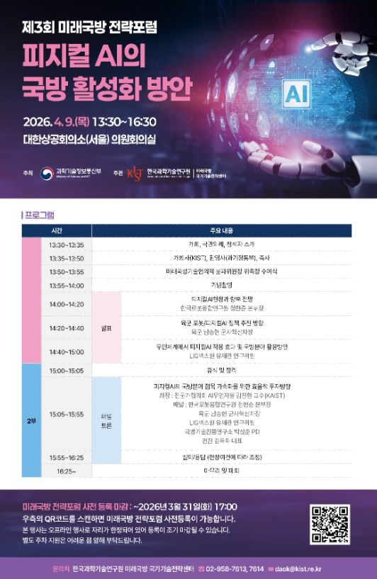 내고향뉴스 김익성 기자 | 과학기술정보통신부는 한국과학기술연구원(원장 오상록)과 함께 4월 9일 대한상공회의소에서 제3회 미래 국방 전략 토론회(전략 포럼)(‘물리적 인공지능'피지컬AI'의 국방 활성화 방안’)을 개최했다고 밝혔다.