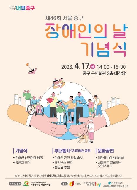 내고향뉴스 김명신 기자 | 서울 중구가 오는 17일 오후 2시, 중구구민회관 3층 대강당에서 '제46회 장애인의 날 기념식'을 개최한다.