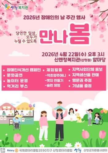 내고향뉴스 김익성 기자 | 산엔청복지관은 장애인의 날을 맞아 ‘만나봄’ 행사를 오는 22일 복지관 앞마당에서 개최한다고 17일 밝혔다.