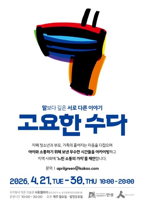 내고향뉴스 김명신 기자 | 안성시 시옷갤러리는 오는 4월 21일부터 4월 30일까지 자폐 청소년과 그 가족이 함께 참여하는 전시 《고요한 수다》를 개최한다고 밝혔다.