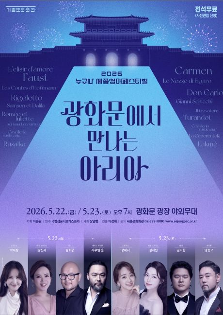 내고향뉴스 김명신 기자 | 세종문화회관은 서울시민 누구나 즐길 수 있는 세종 썸머 페스티벌 '광화문에서 만나는 아리아'를 오는 5월 22일과 23일, 양일간 광화문 광장에서 개최한다. 광화문 광장은 시민 중심의 공간으로 새롭게 거듭난 이후 서울을 대표하는 문화 명소로 자리해 왔으며, 그 중심에서 세종문화회관은 한국 문화예술을 상징하는 공간으로 자리해 왔다. 이러한 공간적 맥락 속에서 세종문화회관과 광화문 광장은 문화의 전통성과 동시대성을 함께 품은 열린 문화예술 플랫폼으로 그 의미를 확장해가고 있다.