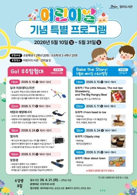 내고향뉴스 김명신 기자 | 제주시 탐라도서관은 어린이날을 맞아 천문학과 베이킹을 주제로 한 특별 체험 프로그램을 5월 10일부터 5월 31일까지 운영한다.