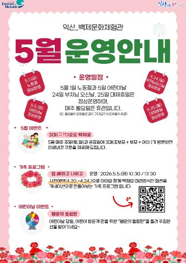 5월 5일 어린이날에는 가족이 함께 카네이션 화관을 만드는 체험을 운영한다. 행사는 오전 10시 30분과 오후 1시 30분에 진행되며, 오는 20~24일 익산시 통합예약시스템을 통해 사전 신청을 받는다.