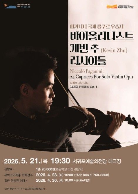내고향뉴스 김명신 기자 | 서귀포예술의전당은 세계 정상급 젊은 연주자를 소개하는 ‘2026 국제콩쿠르 위너스 콘서트 시리즈’의 첫 무대로 ‘파가니니 바이올린 콩쿠르 위너스 콘서트’를 5월 21일 저녁 7시 30분 대극장에서 개최한다.