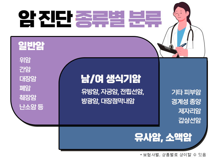 보험사에서 암을 구분할 때 보통 경계성종양, 제자리암, 갑상선암, 기타피부암 등으로 대표되는 유사암과 유방암, 방광암, 전립선암, 자궁암 등으로 대표되는 소액암, 그리고 뼈암이나 뇌암, 췌장암 등은 고액암으로 구분한다. 이들을 제외한 나머지 암은 일반암으로 분류한다. 보통 치료비가 많이 드는 고액암이 다른 암보다 진단금이 높은 편이지만, 보장을 넓게 받기 위해서는 일반암 진단비를 늘리는 것이 유리하다. 또한, 소액암이나 유사암은 발생빈도가 높고 상대적으로 치료비가 적게 들어 일반암 진단비의 약 10%~20% 정도만 지급되므로 사전에 보장금액을 알아볼 필요가 있다.
