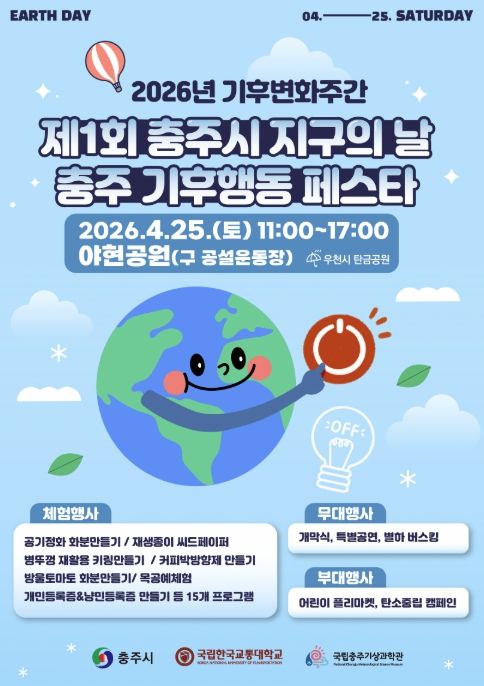 내고향뉴스 김명신 기자 | 충주시는 25일 오전 11시 야현공원(구 공설운동장) 일원에서 ‘2026년 기후변화주간’을 기념해 ‘제1회 충주시 지구의 날’ 행사를 개최한다고 21일 밝혔다.